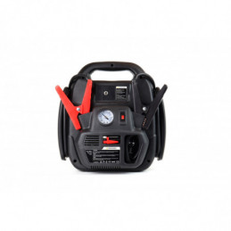 Práctico arrancador y cargador de baterías portátil. Funciona para baterías de 12 voltios y tiene un pico de arranque de 800A. Este arrancador + cargador de baterías cuenta también con powerbank y con linterna de led.
