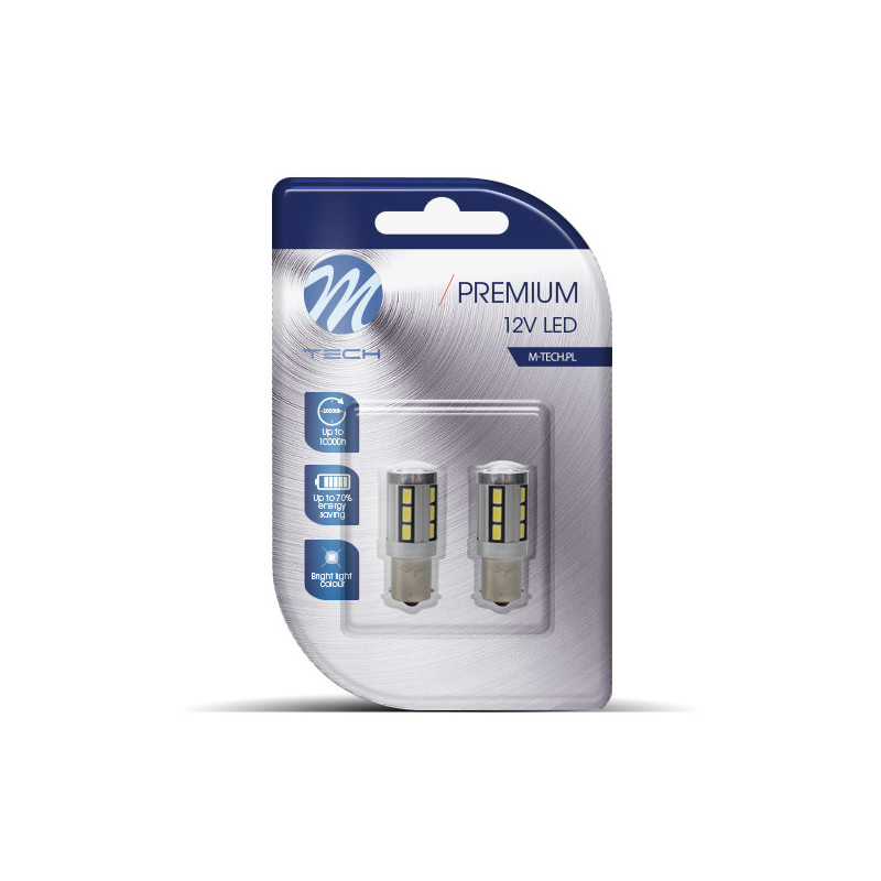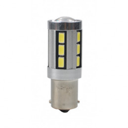 2 bombillas de led blancas de tipo un polo (BA15S P21W) con tecnología de can-bus para evitar el error de bombilla fundida. Cada bombilla tiene 22 leds de tipo SMD.