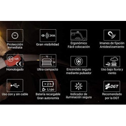 No ocupa apenas espacio,cabe en cualquier compartimento del coche( 50 x 70 mm).Es resistente al agua y al polvo, lo que la convierte en una baliza apta para cualquier emergencia, bajo cualquier condición climatológica.