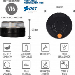• 🚨 HOMOLOGADA: La luz de emergencia V16 puede usarse en todos los vehículos ante un caso de avería o accidente en carretera ya que está homologada y autorizada por la DGT. Cuenta con certificado IDIADA PC21010282, lo que la convierte en compatible con la normativa de seguridad vial vigente.