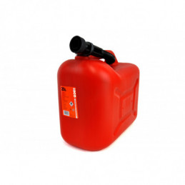 Práctico bidón de gasolina de plástico con capacidad para 5 litros de combustible. El bidón de comustible incluye el surtidor y cumple con las normativas de seguridad europeas.