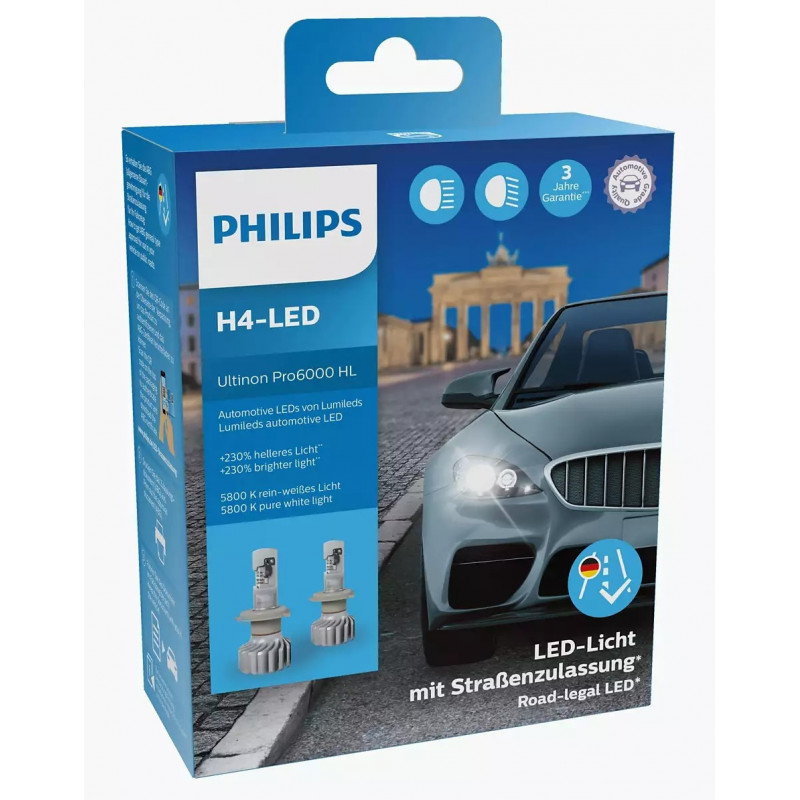 Kit de conversión a led homologado cambiar las luces halógenas H4 de nuestro coche a bombillas H4 led. Más seguridad y más estética gracias a Philips Ultinon Pro6000. Consulte si este kit de led está homologado para su coche.