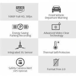 Resolución: Full HD (1920 x 1080) Cámara: 2.1MP CMOS Frecuencia de fotogramas: 30 fps Ángulo de visión: 140° (Diagonal) Dimensiones (An x Prof x Al): 78 x 34,6 x 31,5 mm (3,07 x 1,4 x 1,24 pulgadas) Peso: 42,4 g (0,096 lb) Temperatura de almacenamiento: -20° a 70°C (-4° a 158°F) Temperatura de funcionamiento: -10° a 60°C (14° a 140°F) Capacidad: Tarjeta MicroSD de 8/16/32/64/128 GB (UHS-I) Alimentación de entrada: CC 12/24V, Capacitor Súper Incorporado GPS: Antena GPS [Opcional]