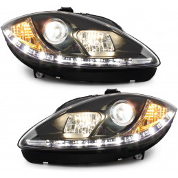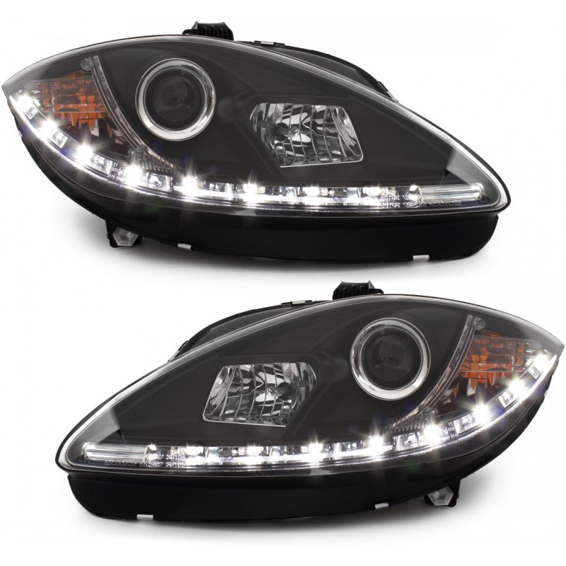 Faros delanteros LITEC para Seat León 1P1 (2009-2012) con luz diurna LED integrada y acabado negro. Diseño moderno con tecnología LED para DRL, homologación europea E-Mark y sustitución directa de los faros originales. Mejora estética y mayor visibilidad manteniendo legalidad en carretera.