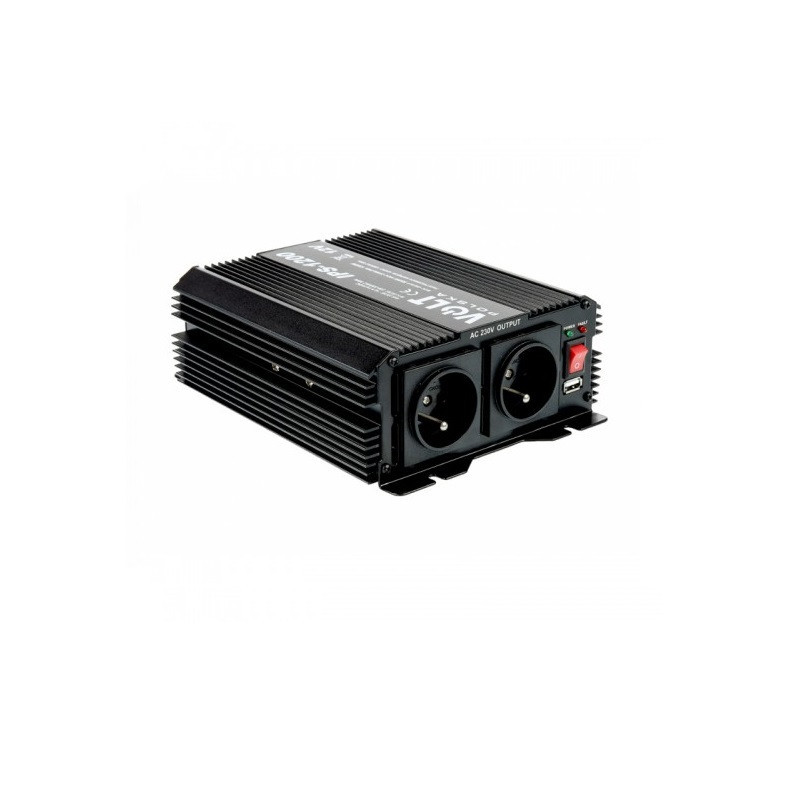 Inversor de corriente para convertir 24 voltios a 230 voltios. Su potencia máxima son 2.000 watios e incluye una salida USB y dos salidas de enchufe 230V.