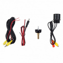 Cámara de estacionamiento miniatura universal con un ángulo de visión de 190°, resolución de 800TVL y protección IP69K. Diseñada para instalación en exteriores, puede montarse en la placa de matrícula, espejos laterales o parrilla frontal. Ofrece opciones de líneas guía y ajuste de orientación de imagen. Compatible con sistemas de 12V y 24V.