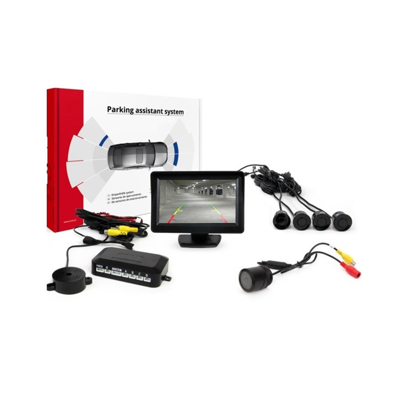 Sensor de Aparcamiento con pantalla TFT 4,3" y con cámara HD. 4 sensores de aparcamiento de color negro.
