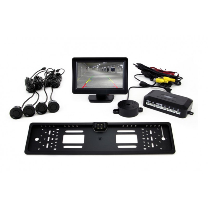 Sensor de Aparcamiento con pantalla TFT 4,3" y con cámara HD. 4 sensores de aparcamiento de color negro.