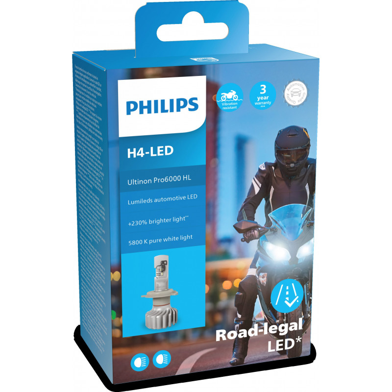 Kit de conversión a led homologado cambiar las luz halógena H4 de nuestra moto a bombilla H4 led. Más seguridad y más estética gracias a Philips Ultinon Pro6000. Consulte si este kit de led está homologado para su moto.
