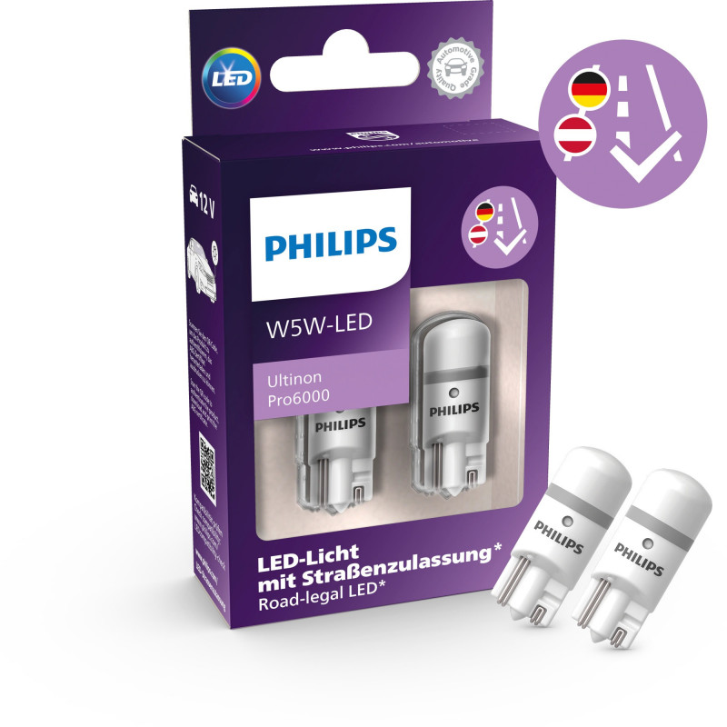 Con una temperatura de color óptima de hasta 6000 Kelvin, la Philips Ultinon Pro6000 W5W LED produce una luz blanca brillante muy parecida a la luz del día y no cansa ni tensa la vista.