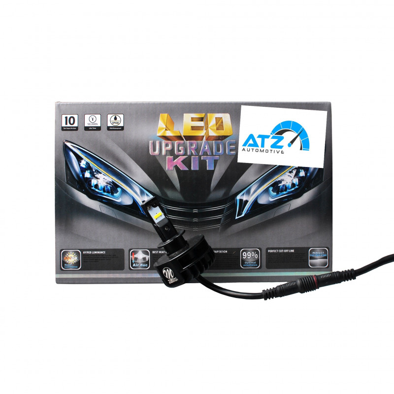 Kit de conversión a LED H10 (tipo 2) de la marca ATZ automotive para convertir la luz halógena amarilla original de nuestros faros a luz blanca pura de led. Kit con refrigeración activa por electroventilador en cada bombilla (color blanco puro).