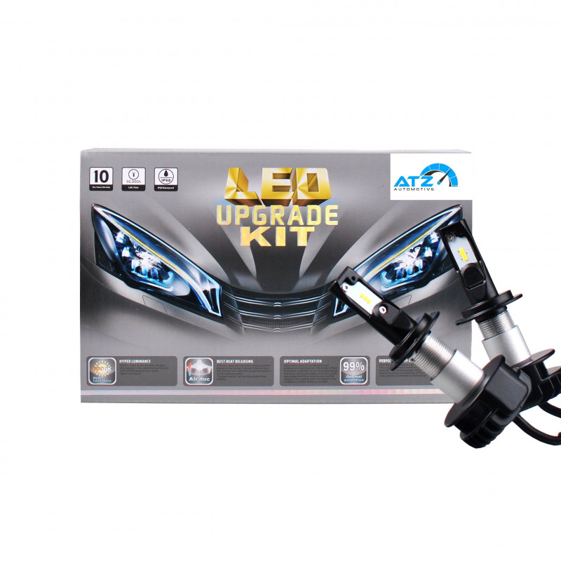 Kit de conversión a LED H4 (tipo 2) de la marca ATZ automotive para convertir la luz halógena amarilla original de nuestros faros a luz blanca pura de led. Kit con refrigeración activa por electroventilador en cada bombilla (color blanco puro).