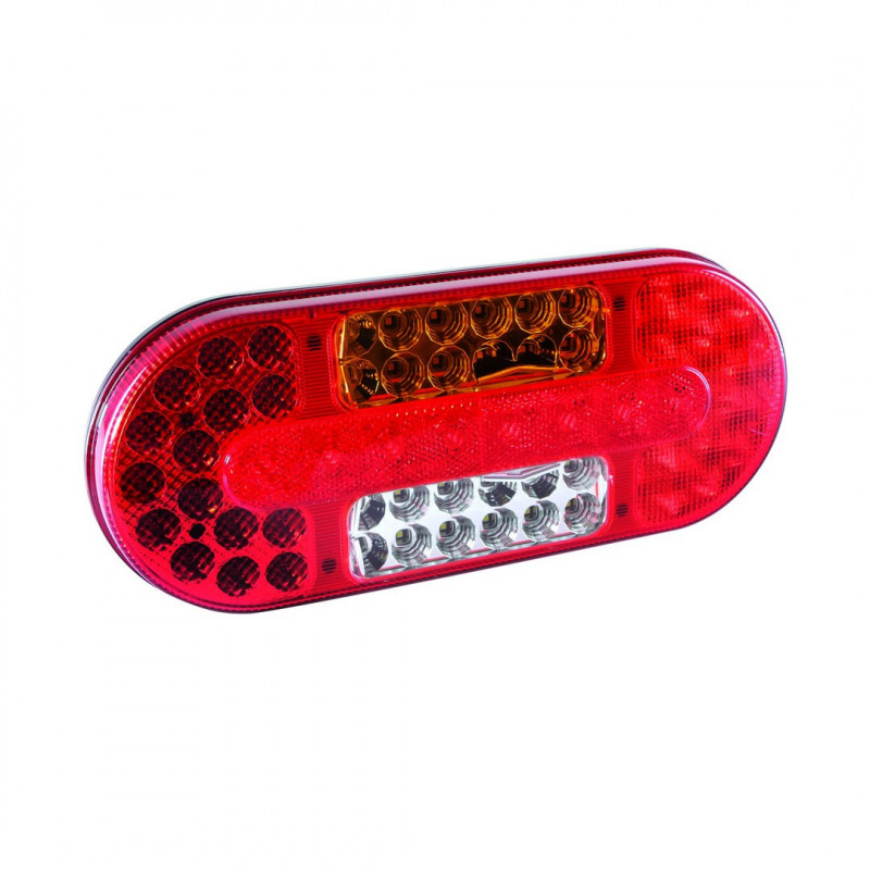 Este piloto trasero de led está compuesto por 62 leds y funciona a 12 y 24 voltios. Su forma es oval y lo podemos montar en cualquier remolque.