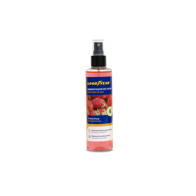 Ambientador en spray con aroma floral en marca Good Year. El ambientador contiene 200 ml. de fragancia.