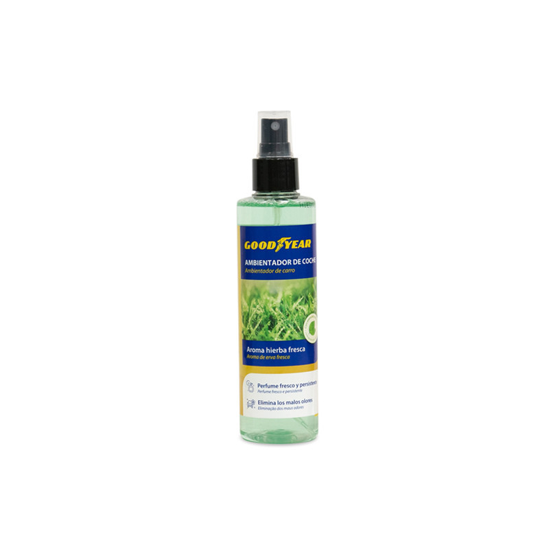 Ambientador en spray con aroma floral en marca Good Year. El ambientador contiene 200 ml. de fragancia.