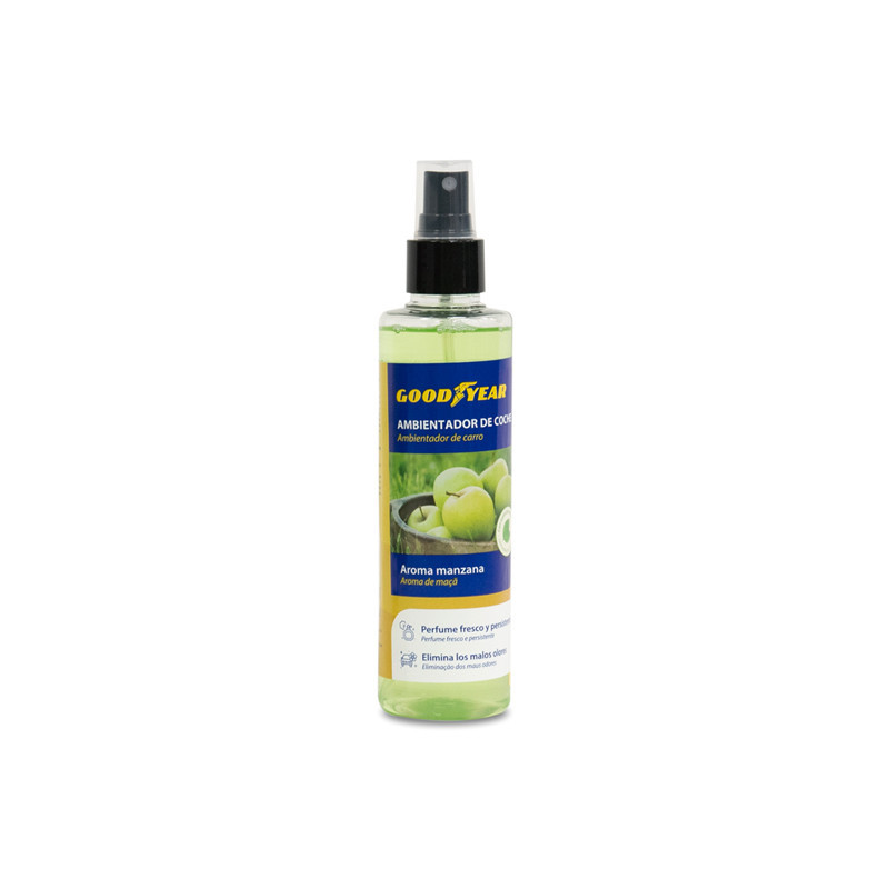 Ambientador en spray con aroma floral en marca Good Year. El ambientador contiene 200 ml. de fragancia.