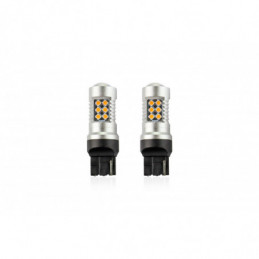 2 bombillas de led de tipo cuña T20 WY21W en color ámbar con tecnología de can-bus para evitar el error de bombilla fundida. Estas bombillas led tienen 24 leds SMD cada una.